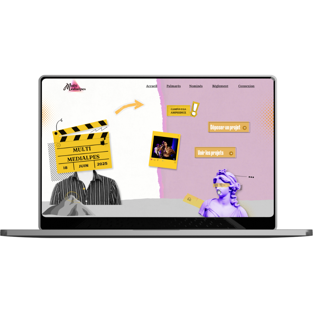 MULTIMEDIALPES est un festival étudiant qui valorise les créations des départements MMI de Grenoble et Chambéry, dans les domaines du web, du design graphique, de l’audiovisuel et de la communication. C’est un événement annuel qui permet de montrer notre travail aux professionnels, aux lycéens et au public de l’UGA. Pour l’édition 2025, on nous a demandé, par groupe, de repenser entièrement l’identité visuelle du festival et de créer une refonte du site web. C’est un projet complet, qui mélange stratégie de communication, direction artistique, UX/UI design et production audiovisuelle. Notre objectif est de concevoir une proposition originale, cohérente et engageante, qui pourrait être sélectionnée pour représenter officiellement le festival cette année.